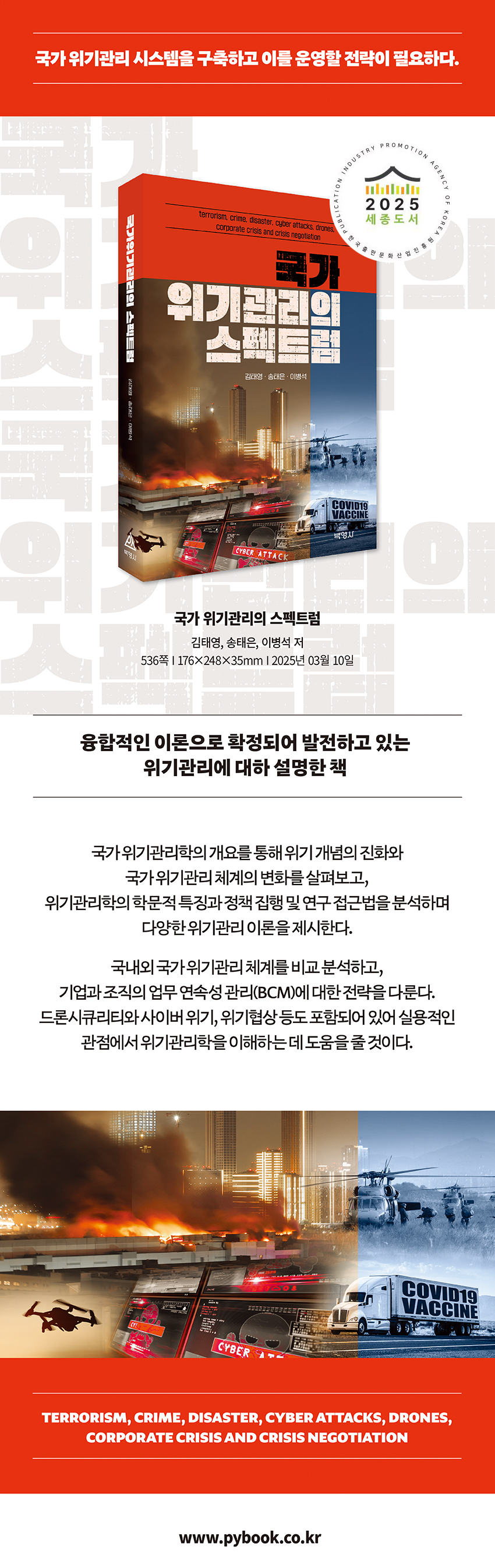 오늘날 세계는 복잡하고 다양한 위협에 직면하고 있다. 테러, 범죄, 자연재난, 사이버 공격, 드론을 활용한 위협, 기업 위기 등은 국가와 조직의 안전을 위협하는 주요 요소가 되었다. 이러한 복합적이고 동시다발적인 위기 상황에서 효과적으로 대응하기 위해서는 국가 차원의 위기관리 시스템을 구축하고, 이를 효율적으로 운영할 전략적 사고와 전문성이 요구된다.