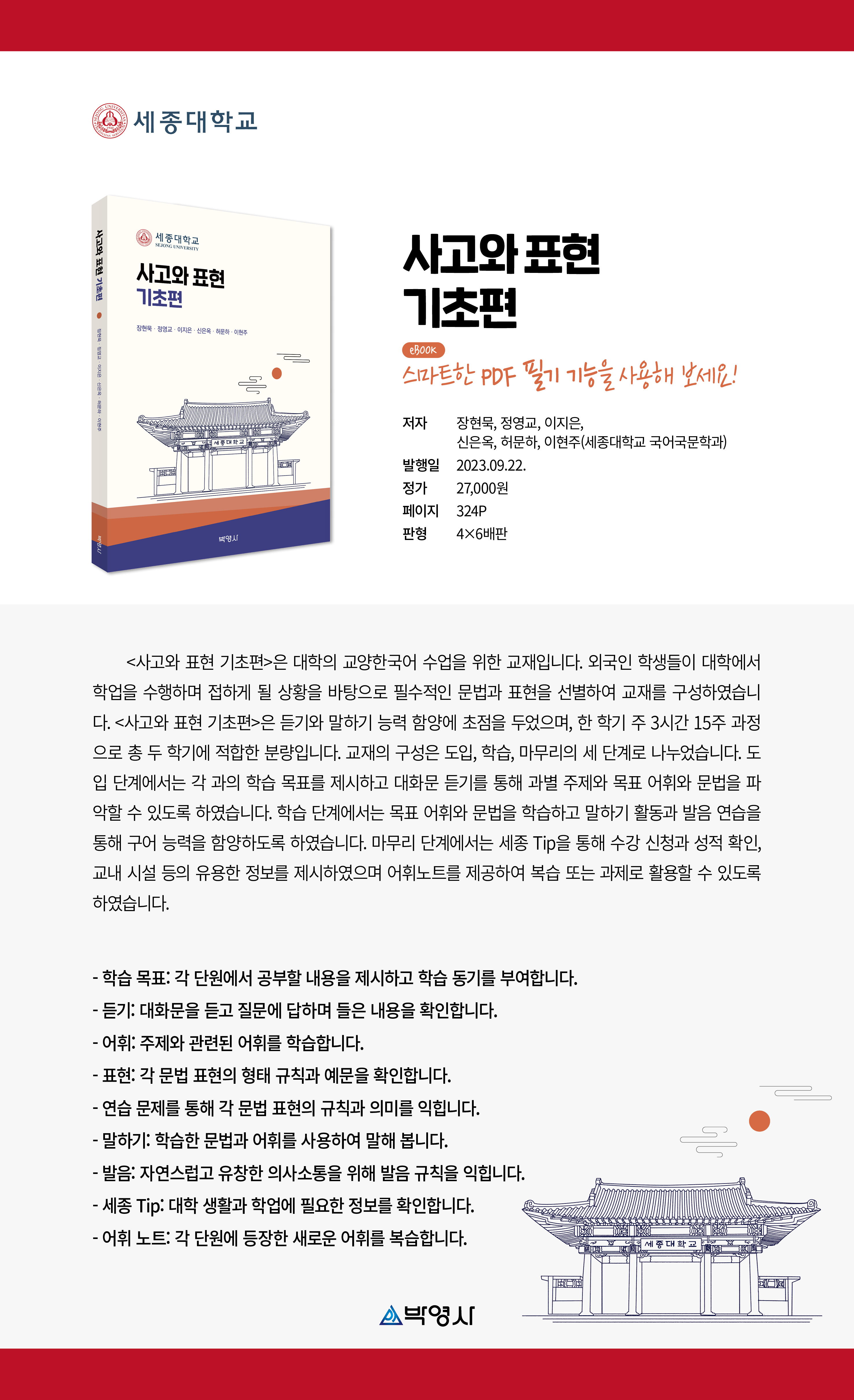 <사고와 표현 기초편>은 대학의 교양한국어 수업을 위한 교재입니다. 외국인 학생들이 대학에서 학업을 수행하며 접하게 될 상황을 바탕으로 필수적인 문법과 표현을 선별하여 교재를 구성하였습니다. <사고와 표현 기초편>은 듣기와 말하기 능력 함양에 초점을 두었으며, 한 학기 주 3시간 15주 과정으로 총 두 학기에 적합한 분량입니다. 교재의 구성은 도입, 학습, 마무리의 세 단계로 나누었습니다. 도입 단계에서는 각 과의 학습 목표를 제시하고 대화문 듣기를 통해 과별 주제와 목표 어휘와 문법을 파악할 수 있도록 하였습니다. 학습 단계에서는 목표 어휘와 문법을 학습하고 말하기 활동과 발음 연습을 통해 구어 능력을 함양하도록 하였습니다. 마무리 단계에서는 세종 Tip을 통해 수강 신청과 성적 확인, 교내 시설 등의 유용한 정보를 제시하였으며 어휘노트를 제공하여 복습 또는 과제로 활용할 수 있도록 하였습니다.
