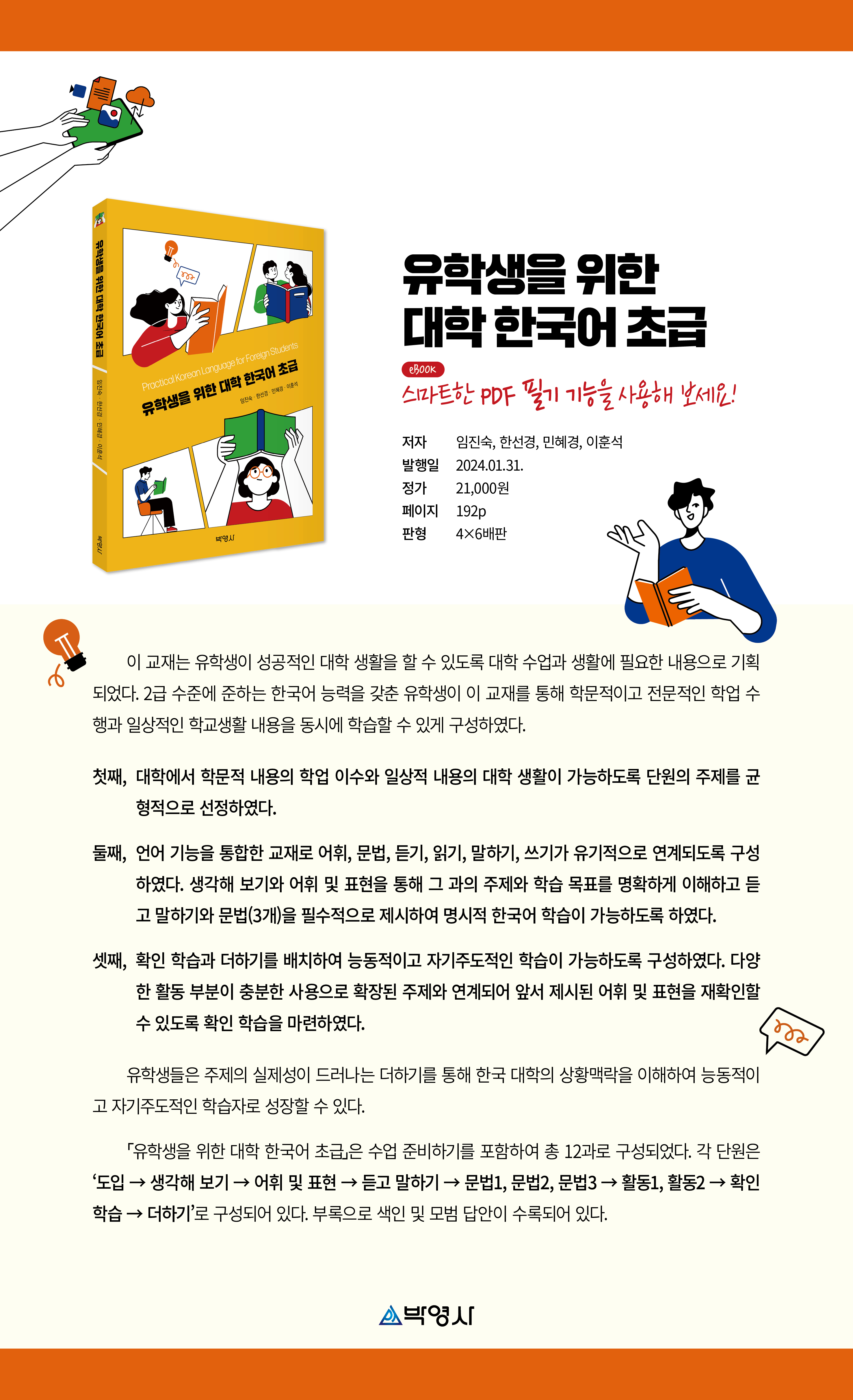 이 교재는 유학생이 성공적인 대학 생활을 할 수 있도록 대학 수업과 생활에 필요한 내용으로 기획되었다. 2급 수준에 준하는 한국어 능력을 갖춘 유학생이 이 교재를 통해 학문적이고 전문적인 학업 수행과 일상적인 학교생활 내용을 동시에 학습할 수 있게 구성하였다.